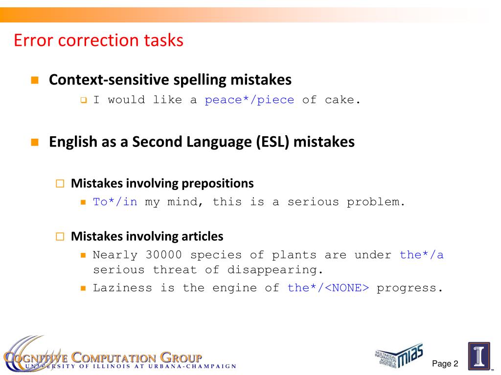 Error correction tasks • Context-sensitive spelling mistakes • I would like a peace*/piece of cake. • English as a Second Language (ESL) mistakes • Mistakes involving prepositions • To*/in my mind, this is a serious problem. • Mistakes involving articles • Nearly 30000 species of plants are under the*/a serious threat of disappearing. • Laziness is the engine of the*/<NONE> progress.