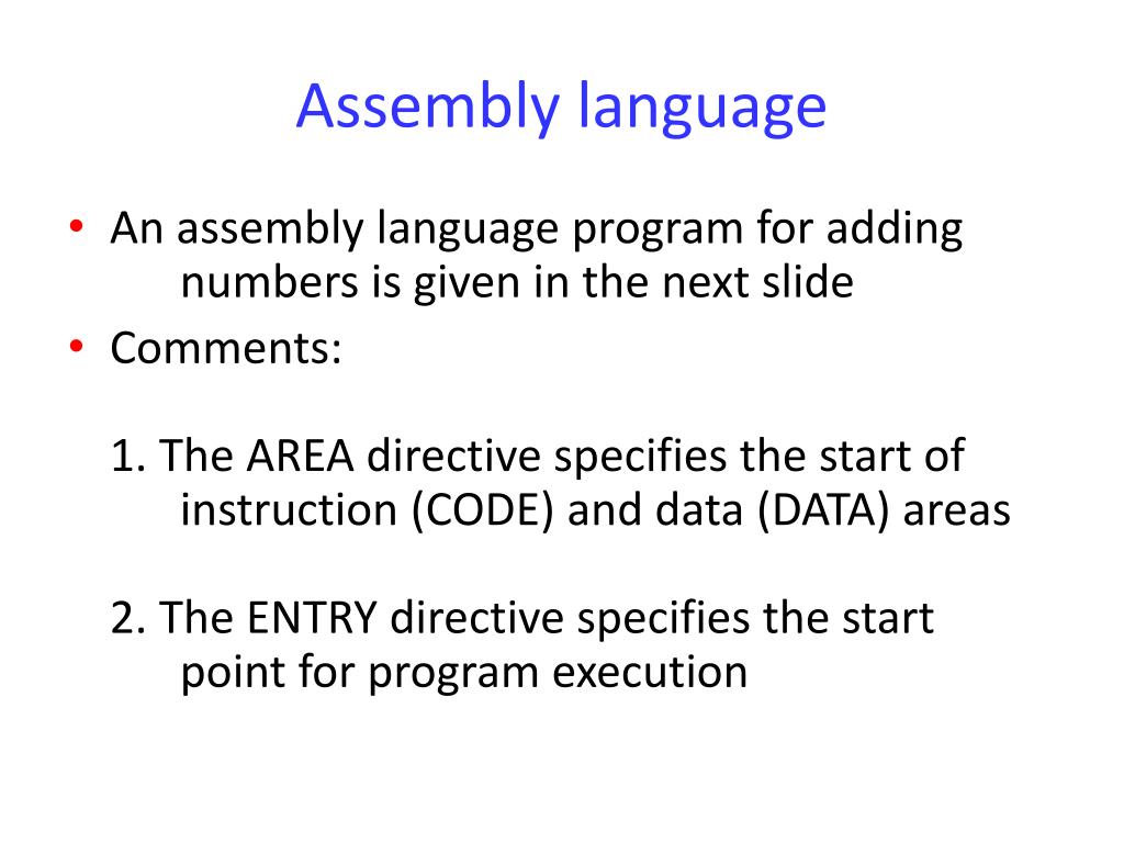 Assembly language • An assembly language program for adding numbers is given in the next slide • Comments:1. The AREA directive specifies the start of instruction (CODE) and data (DATA) areas2. The ENTRY directive specifies the start point for program execution