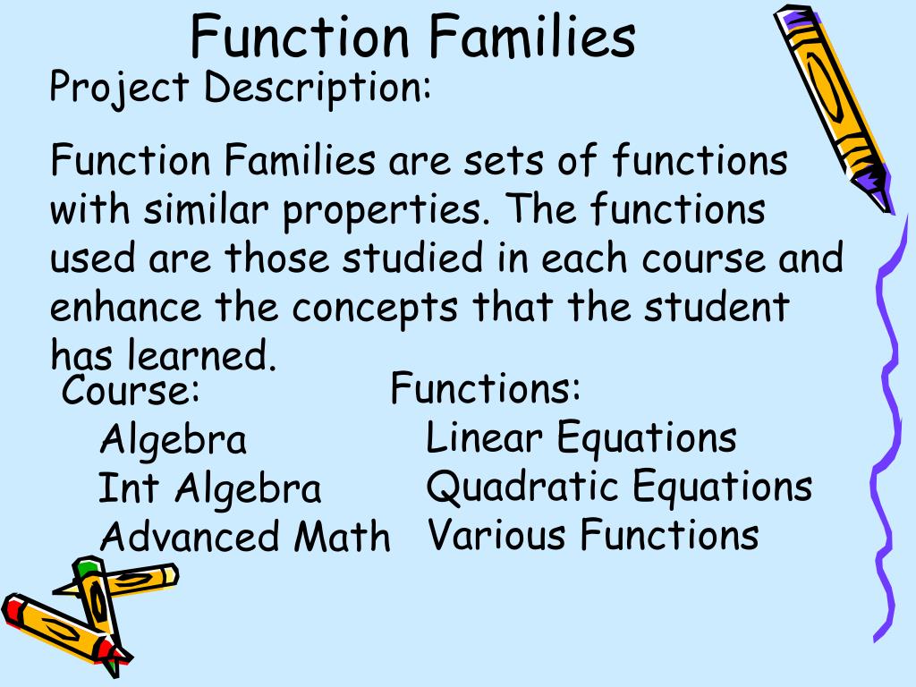 Function Families Project Description: Function Families are sets of functions with similar properties. The functions used are those studied in each course and enhance the concepts that the student has learned. Functions: Linear Equations Quadratic Equations Various Functions Course: Algebra Int Algebra Advanced Math