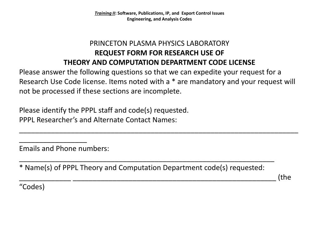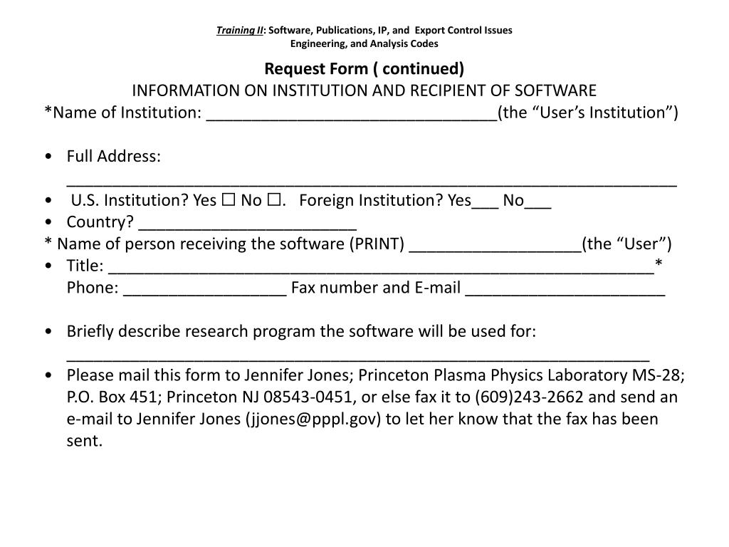 Training II: Software, Publications, IP, andExport Control IssuesEngineering, and Analysis Codes • Request Form ( continued) • INFORMATION ON INSTITUTION AND RECIPIENT OF SOFTWARE • *Name of Institution: ________________________________(the “User’s Institution”) • Full Address: ___________________________________________________________________ • U.S. Institution? Yes ☐ No ☐. Foreign Institution? Yes___ No___ • Country? ________________________ • * Name of person receiving the software (PRINT) ___________________(the “User”) • Title: ____________________________________________________________* Phone: __________________ Fax number and E-mail ______________________ • Briefly describe research program the software will be used for: ________________________________________________________________ • Please mail this form to Jennifer Jones; Princeton Plasma Physics Laboratory MS-28; P.O. Box 451; Princeton NJ 08543-0451, or else fax it to (609)243-2662 and send an e-mail to Jennifer Jones (jjones@pppl.gov) to let her know that the fax has been sent.
