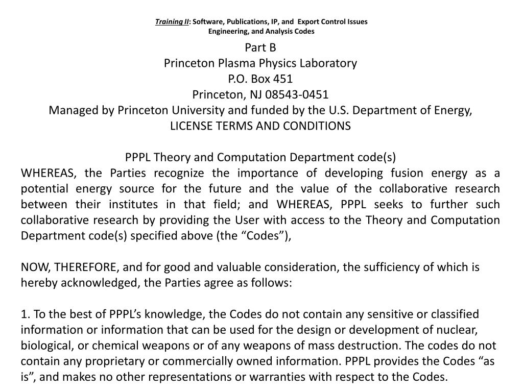 Training II: Software, Publications, IP, andExport Control IssuesEngineering, and Analysis Codes Part B Princeton Plasma Physics Laboratory P.O. Box 451 Princeton, NJ 08543-0451 Managed by Princeton University and funded by the U.S. Department ofEnergy, LICENSE TERMS AND CONDITIONS PPPL Theory and Computation Department code(s) WHEREAS, thePartiesrecognizetheimportanceofdevelopingfusionenergy as a potentialenergysource forthefuture and thevalueofthecollaborativeresearchbetweentheirinstitutesin thatfield; and WHEREAS, PPPL seeks to further such collaborativeresearch by providingthe User withaccessto theTheory and Computation Department code(s) specifiedabove (the “Codes”), NOW, THEREFORE, and forgood and valuableconsideration, thesufficiencyofwhichis herebyacknowledged, thePartiesagree as follows: 1. To thebestofPPPL’sknowledge, theCodes do not containany sensitive orclassified informationorinformationthatcanbeusedforthe design ordevelopmentofnuclear, biological, orchemicalweaponsorofanyweaponsofmassdestruction. Thecodes do not containanyproprietaryorcommerciallyownedinformation. PPPL providestheCodes “as is”, and makes no otherrepresentationsorwarrantieswithrespect to theCodes.