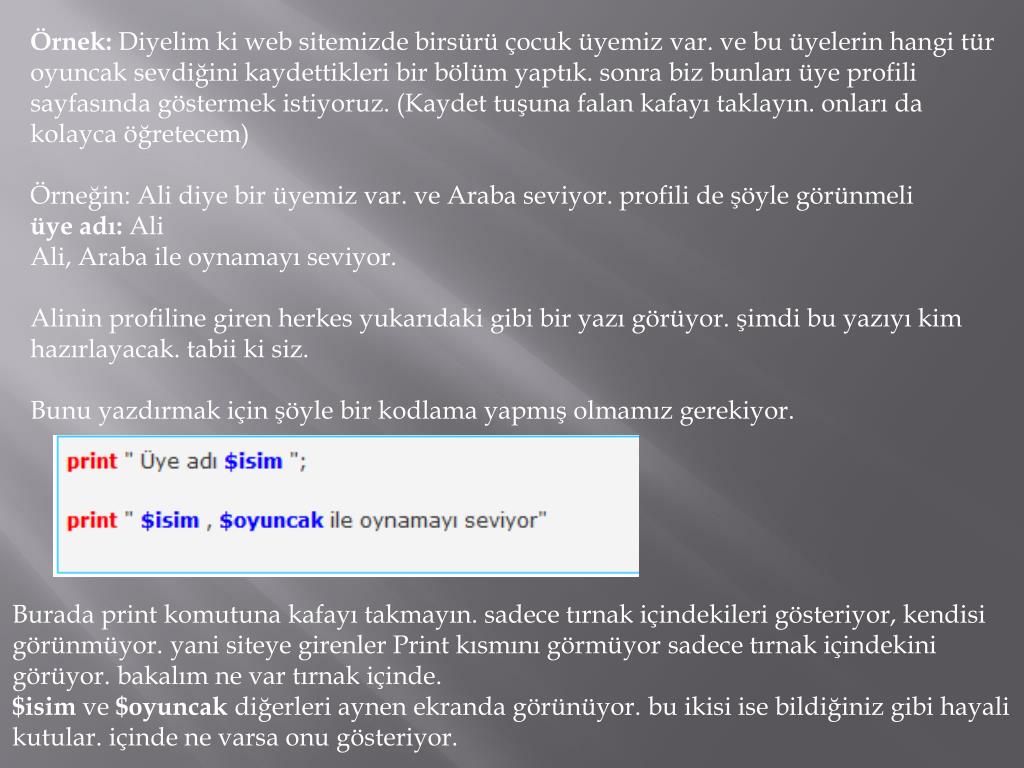 Örnek: Diyelim ki web sitemizde birsürü çocuk üyemiz var. ve bu üyelerin hangi tür oyuncak sevdiğini kaydettikleri bir bölüm yaptık. sonra biz bunları üye profili sayfasında göstermek istiyoruz. (Kaydet tuşuna falan kafayı taklayın. onları da kolayca öğretecem) Örneğin: Ali diye bir üyemiz var. ve Araba seviyor. profili de şöyle görünmeli üye adı:AliAli, Araba ile oynamayı seviyor. Alinin profiline giren herkes yukarıdaki gibi bir yazı görüyor. şimdi bu yazıyı kim hazırlayacak. tabii ki siz. Bunu yazdırmak için şöyle bir kodlama yapmış olmamız gerekiyor. Burada print komutuna kafayı takmayın. sadece tırnak içindekileri gösteriyor, kendisi görünmüyor. yani siteye girenler Print kısmını görmüyor sadece tırnak içindekini görüyor. bakalım ne var tırnak içinde. $isim ve $oyuncak diğerleri aynen ekranda görünüyor. bu ikisi ise bildiğiniz gibi hayali kutular. içinde ne varsa onu gösteriyor.