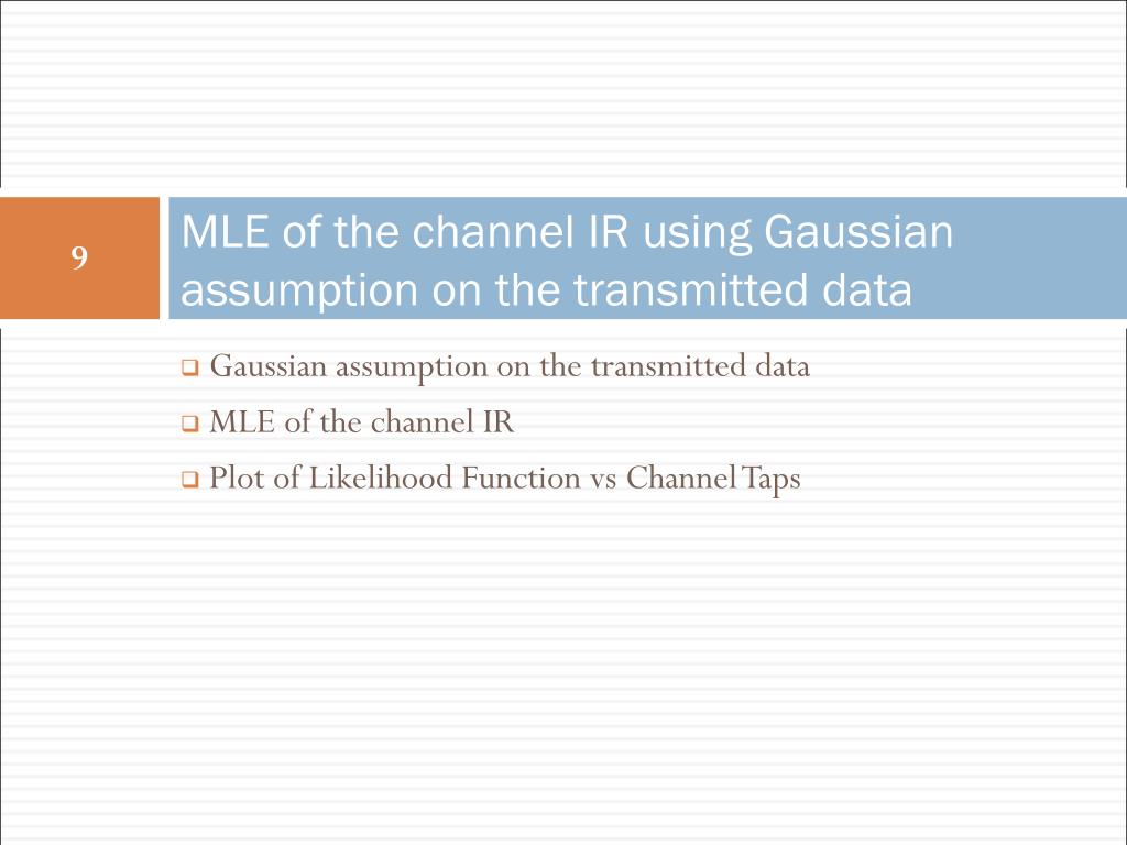 Gaussian assumption on the transmitted data MLE of the channel IR Plot of Likelihood Function vs Channel Taps MLE of the channel IR using Gaussian assumption on the transmitted data 9