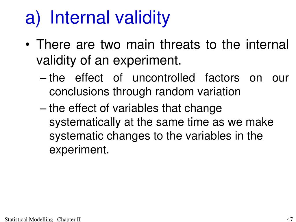a) Internal validity • There are two main threats to the internal validity of an experiment. • the effect of uncontrolled factors on our conclusions through random variation • the effect of variables that change systematically at the same time as we make systematic changes to the variables in the experiment. Statistical Modelling Chapter II