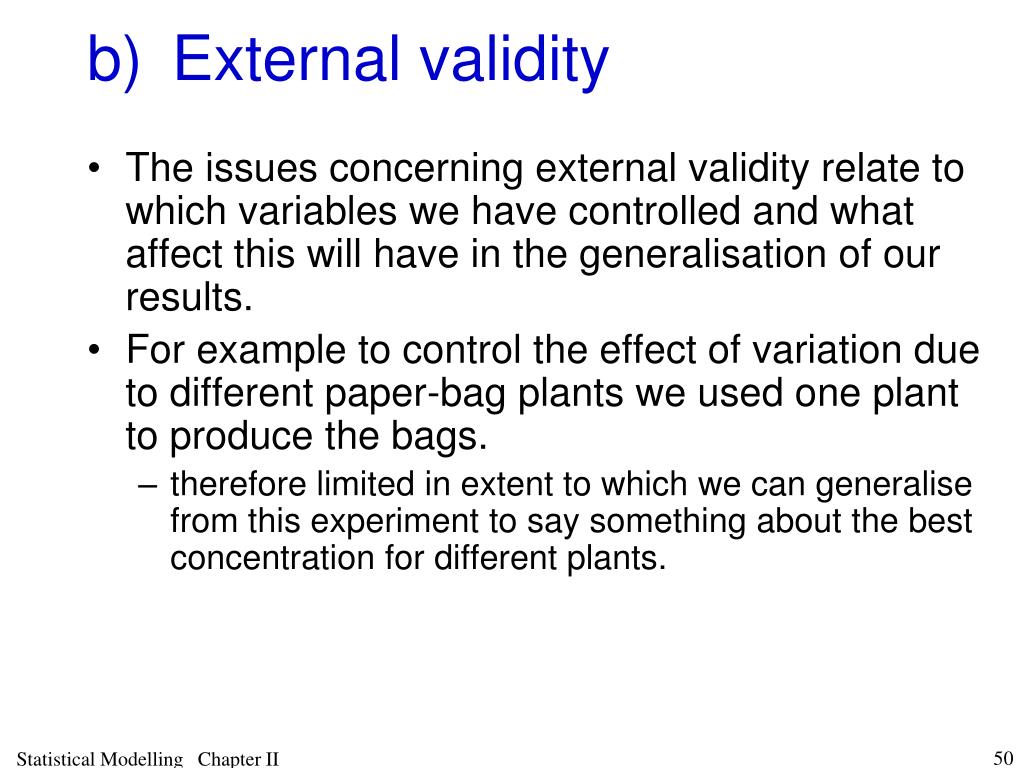 b) External validity • The issues concerning external validity relate to which variables we have controlled and what affect this will have in the generalisation of our results. • For example to control the effect of variation due to different paper-bag plants we used one plant to produce the bags. • therefore limited in extent to which we can generalise from this experiment to say something about the best concentration for different plants. Statistical Modelling Chapter II