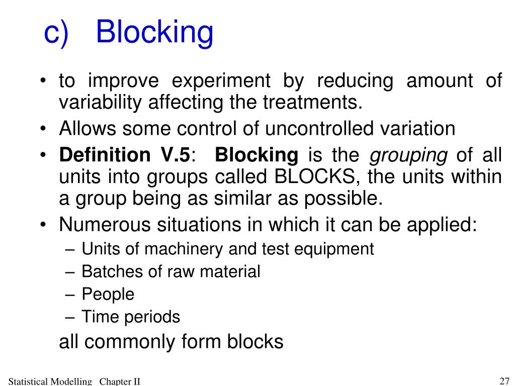 c) Blocking • to improve experiment by reducing amount of variability affecting the treatments. • Allows some control of uncontrolled variation • Definition V.5: Blocking is the grouping of all units into groups called BLOCKS, the units within a group being as similar as possible. • Numerous situations in which it can be applied: • Units of machinery and test equipment • Batches of raw material • People • Time periods all commonly form blocks Statistical Modelling Chapter II