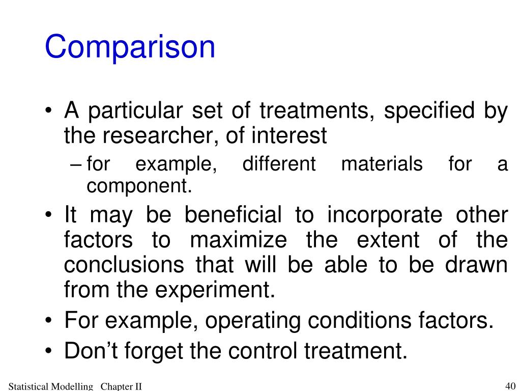 Comparison • A particular set of treatments, specified by the researcher, of interest • for example, different materials for a component. • It may be beneficial to incorporate other factors to maximize the extent of the conclusions that will be able to be drawn from the experiment. • For example, operating conditions factors. • Don’t forget the control treatment. Statistical Modelling Chapter II