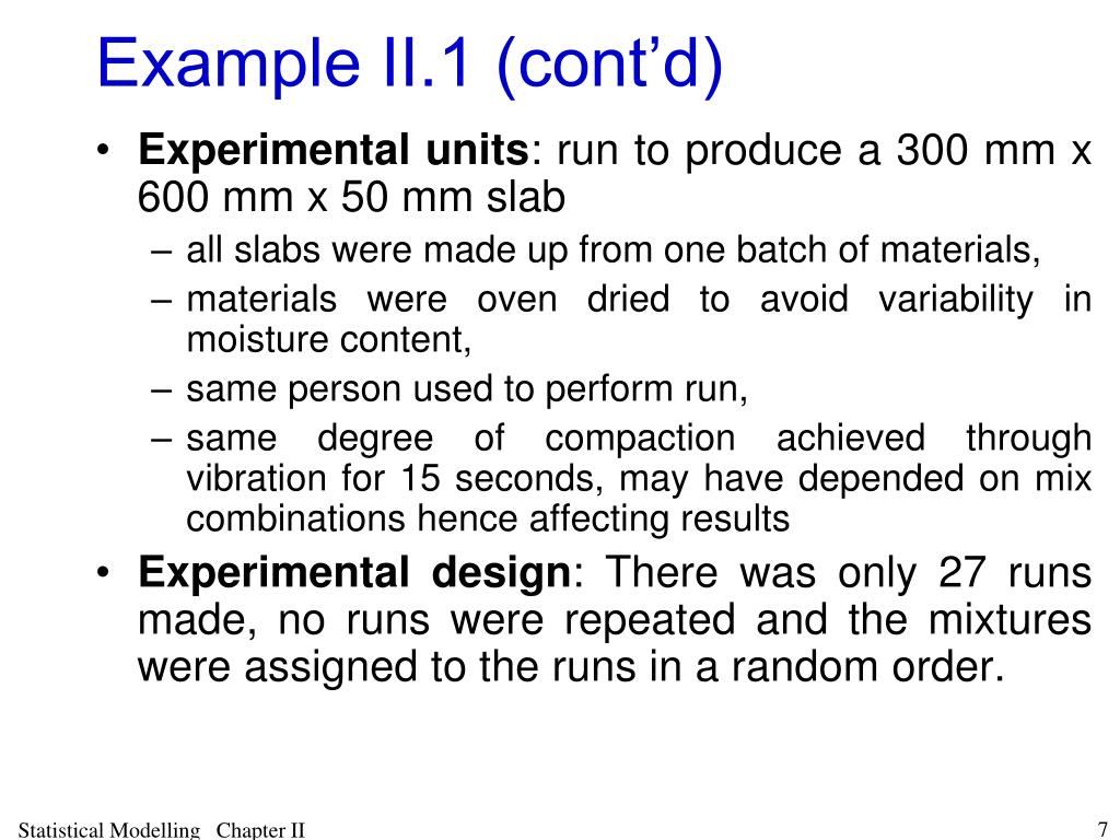 Example II.1 (cont’d) • Experimental units: run to produce a 300 mm x 600 mm x 50 mm slab • all slabs were made up from one batch of materials, • materials were oven dried to avoid variability in moisture content, • same person used to perform run, • same degree of compaction achieved through vibration for 15 seconds, may have depended on mix combinations hence affecting results • Experimental design: There was only 27 runs made, no runs were repeated and the mixtures were assigned to the runs in a random order. Statistical Modelling Chapter II