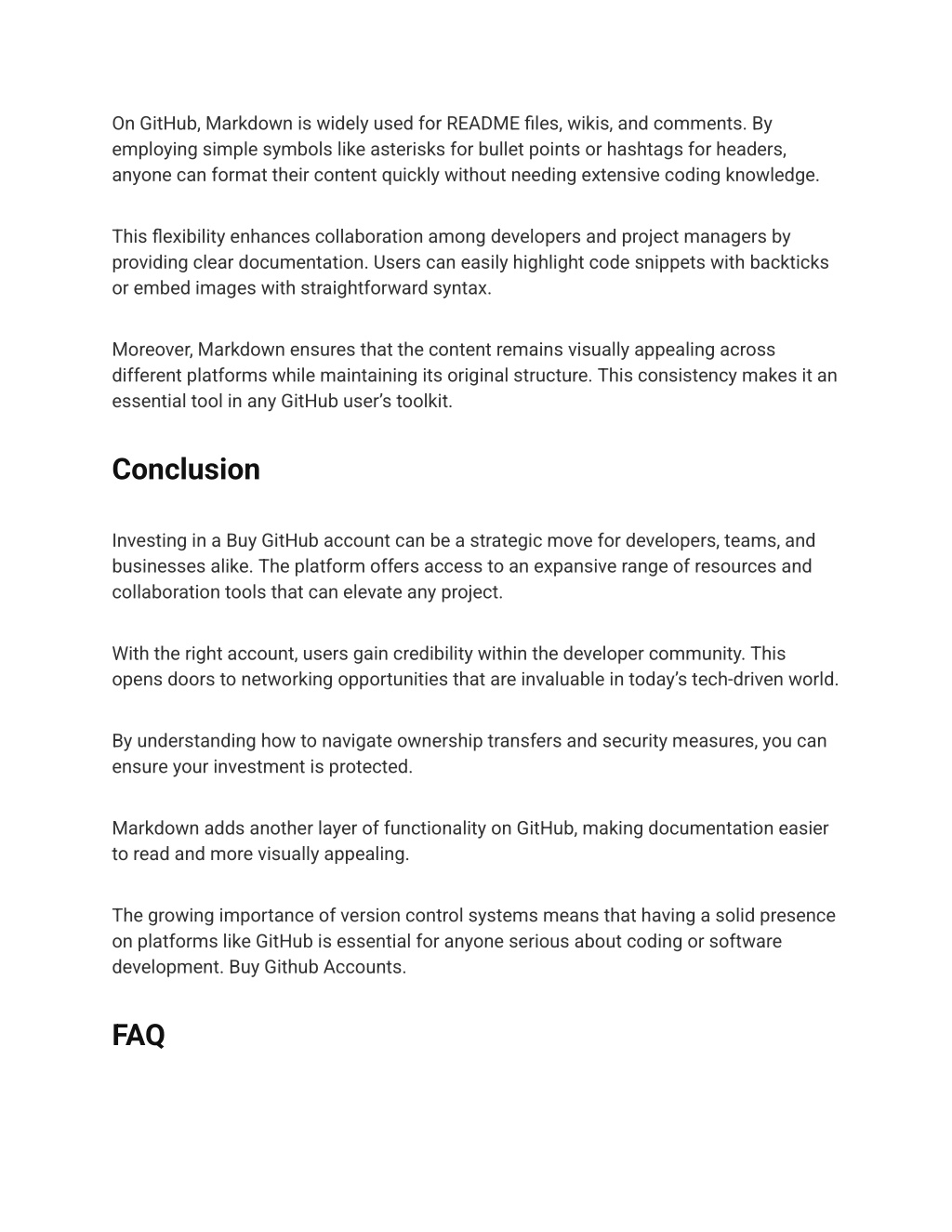 8. On GitHub, Markdown is widely used for README files, wikis, and comments. By employing simple symbols like asterisks for bullet points or hashtags for headers, anyone can format their content quickly without needing extensive coding knowledge. This flexibility enhances collaboration among developers and project managers by providing clear documentation. Users can easily highlight code snippets with backticks or embed images with straightforward syntax. Moreover, Markdown ensures that the content remains visually appealing across different platforms while maintaining its original structure. This consistency makes it an essential tool in any GitHub user’s toolkit. Conclusion Investing in a Buy GitHub account can be a strategic move for developers, teams, and businesses alike. The platform offers access to an expansive range of resources and collaboration tools that can elevate any project. With the right account, users gain credibility within the developer community. This opens doors to networking opportunities that are invaluable in today’s tech-driven world. By understanding how to navigate ownership transfers and security measures, you can ensure your investment is protected. Markdown adds another layer of functionality on GitHub, making documentation easier to read and more visually appealing. The growing importance of version control systems means that having a solid presence on platforms like GitHub is essential for anyone serious about coding or software development. Buy Github Accounts. FAQ