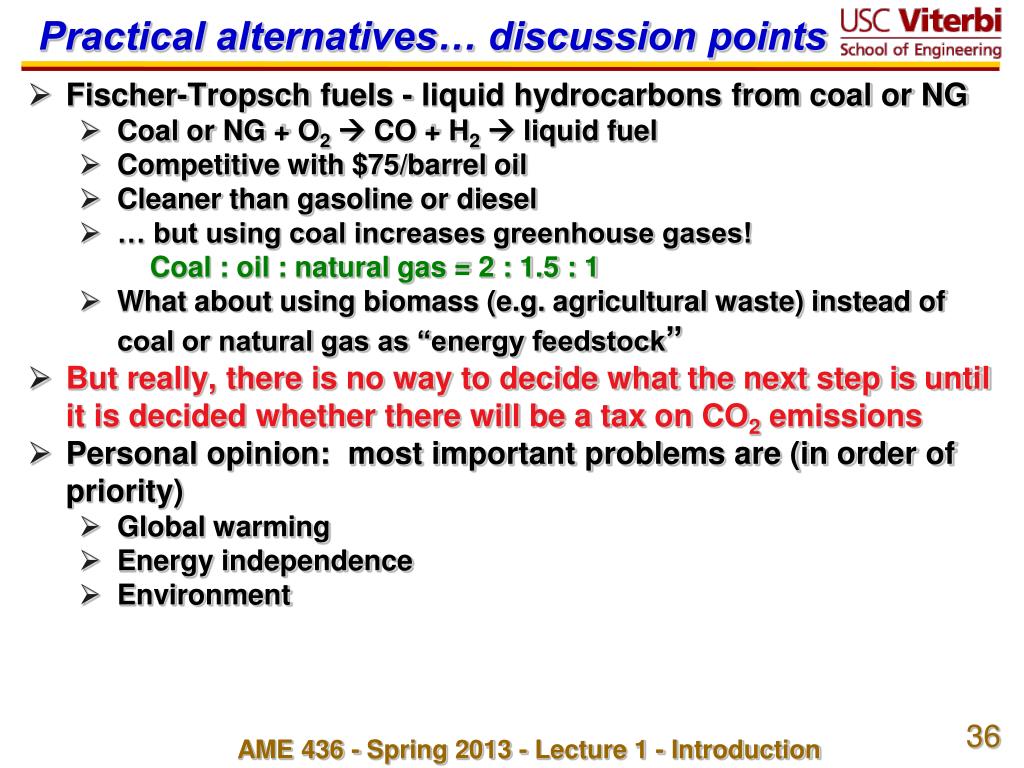 Practical alternatives… discussion points • Fischer-Tropsch fuels - liquid hydrocarbons from coal or NG • Coal or NG + O2 CO + H2 liquid fuel • Competitive with $75/barrel oil • Cleaner than gasoline or diesel • … but using coal increases greenhouse gases! Coal : oil : natural gas = 2 : 1.5 : 1 • What about using biomass (e.g. agricultural waste) instead of coal or natural gas as “energy feedstock” • But really, there is no way to decide what the next step is until it is decided whether there will be a tax on CO2 emissions • Personal opinion: most important problems are (in order of priority) • Global warming • Energy independence • Environment AME 436 - Spring 2013 - Lecture 1 - Introduction