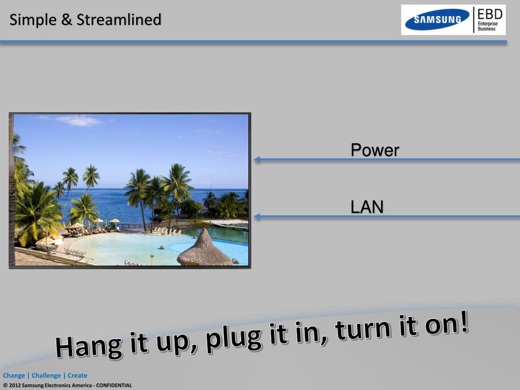 Cumulative Benefits • Reduces upfront hardware investment • + • Simplifies and streamlines installation • + • Further reduces power consumption • + • Supports software and content developers • = • Reduced TCO and increased ROI The benefits of the Smart Signage Platform add up at each step in the deployment process: