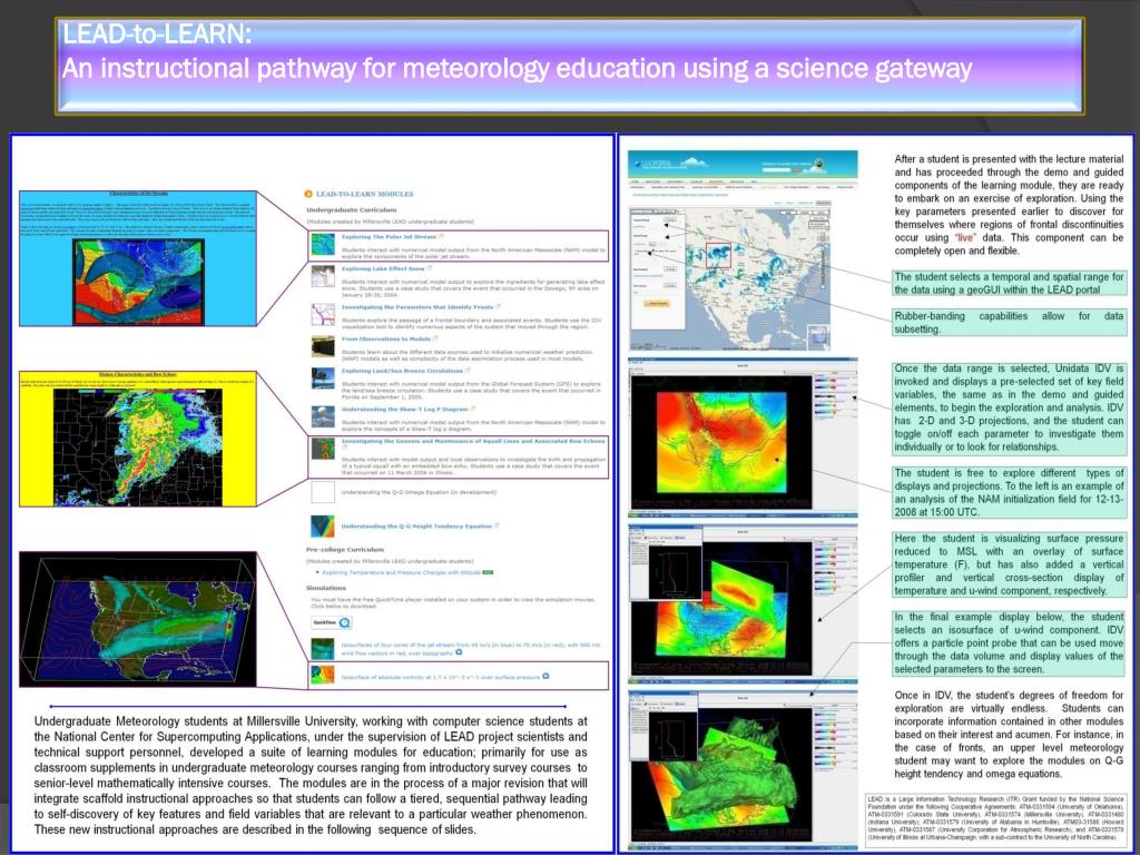 9. LEAD-to-LEARN:An instructional pathway for meteorology education using a science gateway Undergraduate Meteorology students at Millersville University, working with computer science students at the National Center for Supercomputing Applications, under the supervision of LEAD project scientists and technical support personnel, developed a suite of learning modules for education; primarily for use as classroom supplements in undergraduate meteorology courses ranging from introductory survey courses to senior-level mathematically intensive courses. The modules are in the process of a major revision that will integrate scaffold instructional approaches so that students can follow a tiered, sequential pathway leading to self-discovery of key features and field variables that are relevant to a particular weather phenomenon. These new instructional approaches are described in the following sequence of slides.