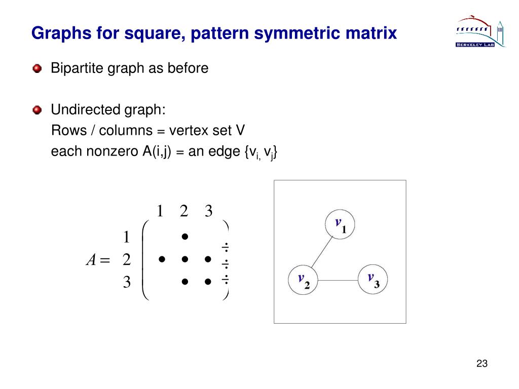 Graphs for square, pattern symmetric matrix • Bipartite graph as before • Undirected graph: Rows / columns = vertex set V each nonzero A(i,j) = an edge {vi, vj}