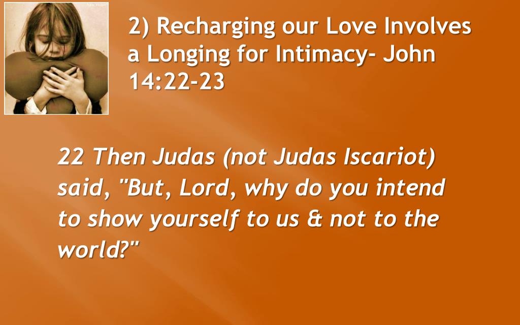 2) Recharging our Love Involves a Longing for Intimacy- John 14:22-23 22 Then Judas (not Judas Iscariot) said, "But, Lord, why do you intend to show yourself to us & not to the world?"
