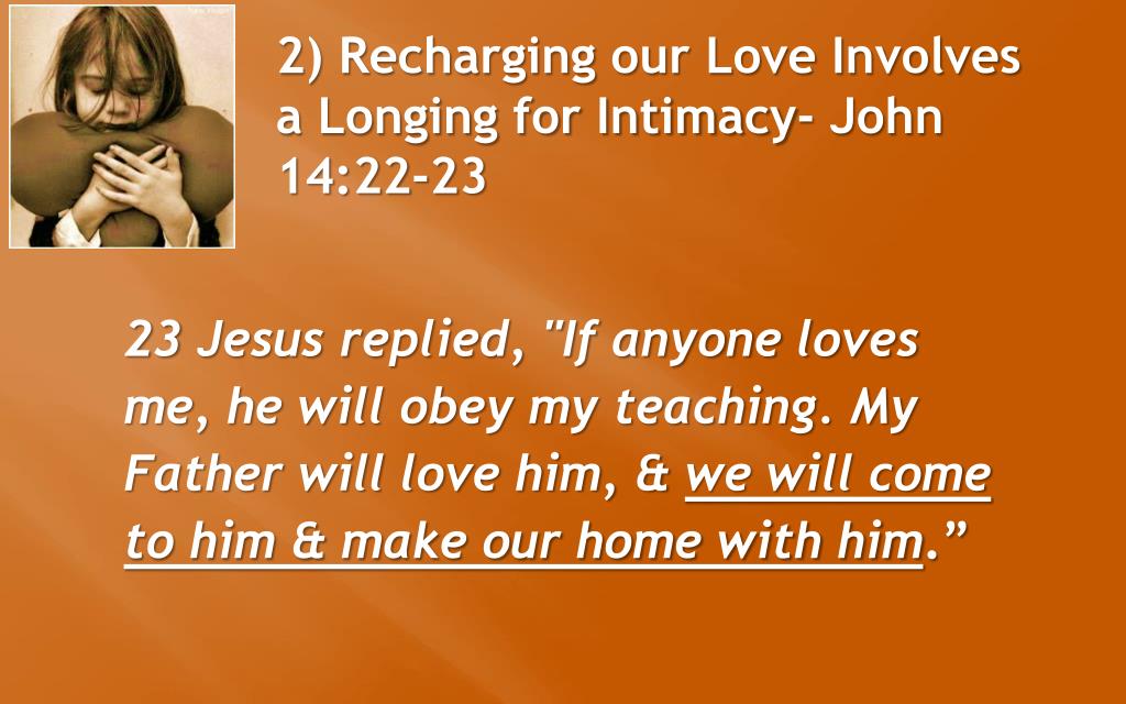 2) Recharging our Love Involves a Longing for Intimacy- John 14:22-23 23 Jesus replied, "If anyone loves me, he will obey my teaching. My Father will love him, & we will come to him & make our home with him.”