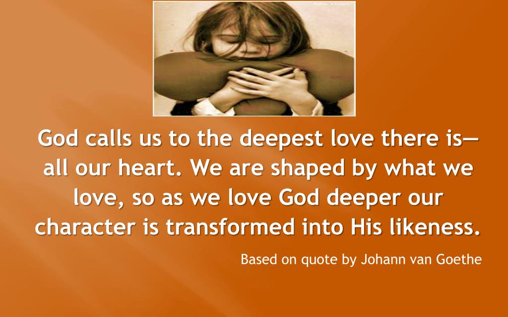 God calls us to the deepest love there is—all our heart. We are shaped by what we love, so as we love God deeper our character is transformed into His likeness. Based on quote by Johann van Goethe