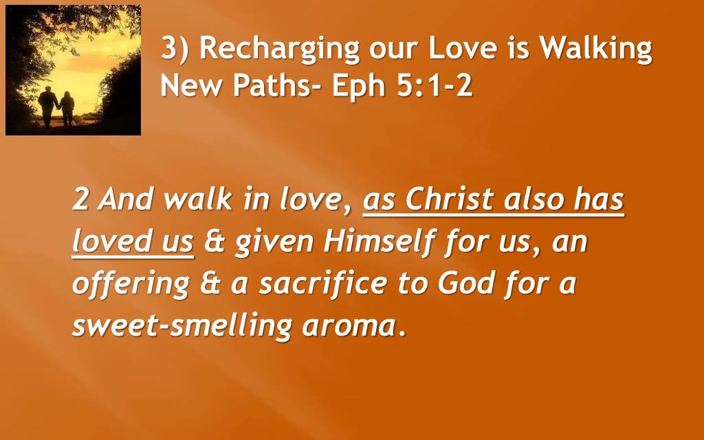 3) Recharging our Love is Walking New Paths- Eph 5:1-2 2 And walk in love, as Christ also has loved us & given Himself for us, an offering & a sacrifice to God for a sweet-smelling aroma.