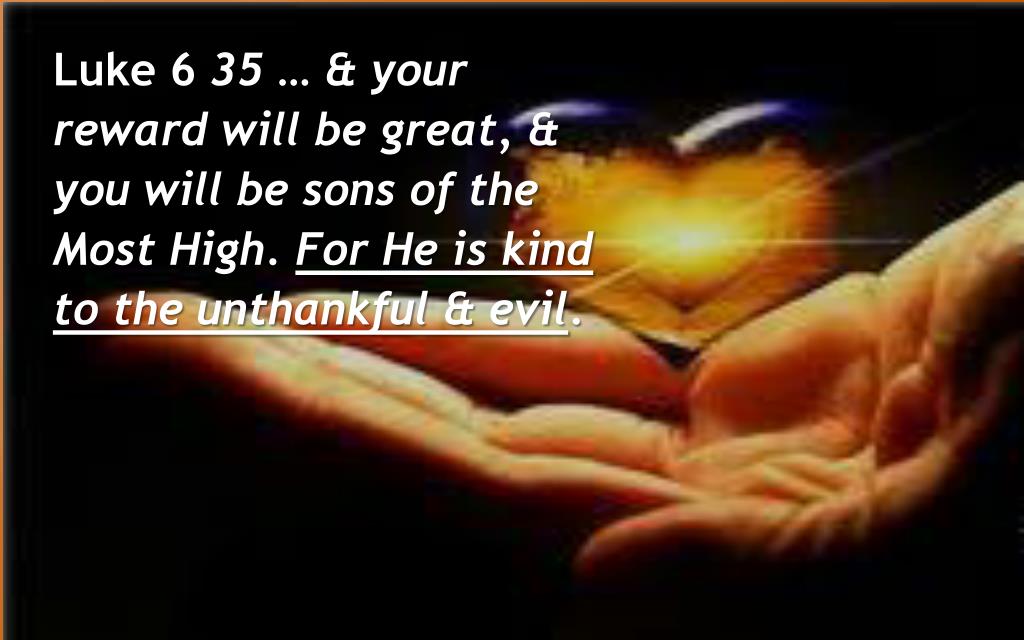 Luke 6 35 … & your reward will be great, & you will be sons of the Most High. For He is kind to the unthankful & evil.