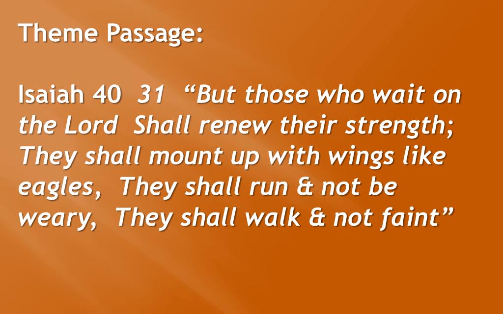 Theme Passage: Isaiah 40 31 “But those who wait on the Lord Shall renew their strength; They shall mount up with wings like eagles, They shall run & not be weary, They shall walk & not faint”
