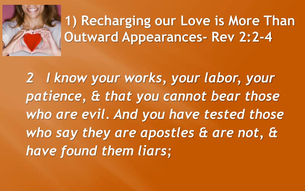 1) Recharging our Love is More Than Outward Appearances- Rev 2:2-4 2 I know your works, your labor, your patience, & that you cannot bear those who are evil. And you have tested those who say they are apostles & are not, & have found them liars;