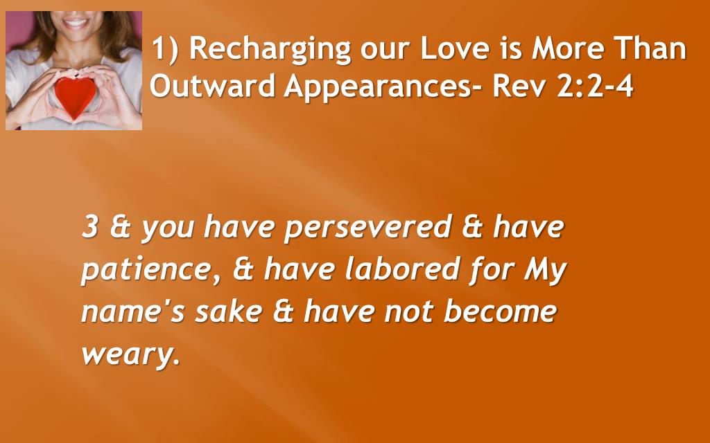 1) Recharging our Love is More Than Outward Appearances- Rev 2:2-4 3 & you have persevered & have patience, & have labored for My name's sake & have not become weary.