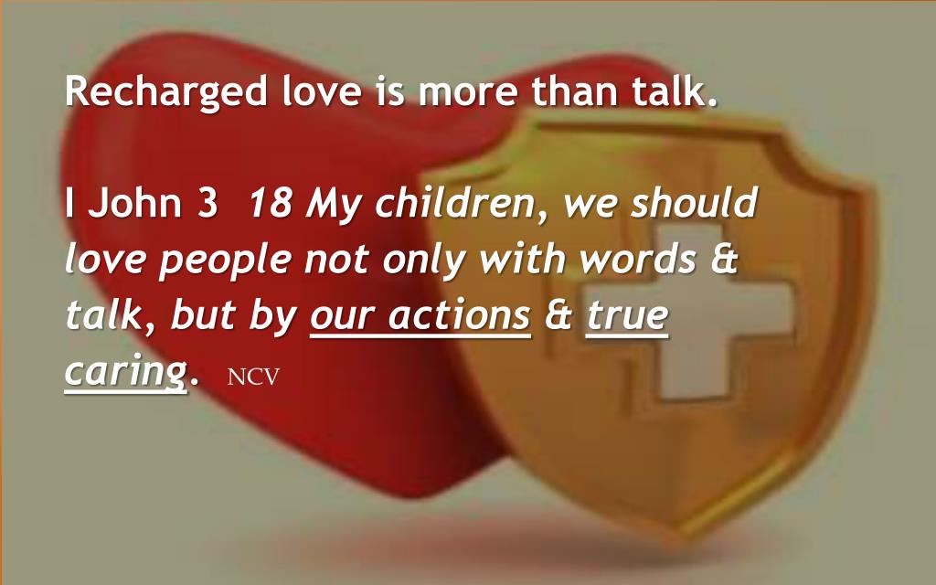 Recharged love is more than talk. I John 3 18 My children, we should love people not only with words & talk, but by our actions & true caring. NCV