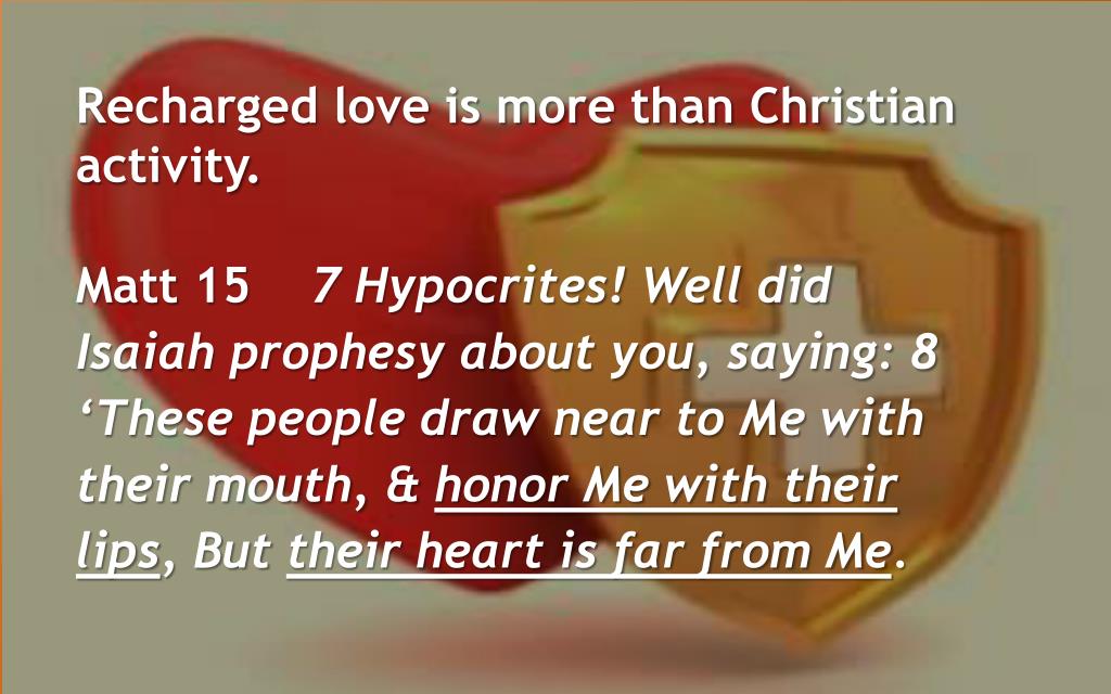 Recharged love is more than Christian activity. Matt 15 7 Hypocrites! Well did Isaiah prophesy about you, saying: 8 ‘These people draw near to Me with their mouth, & honor Me with their lips, But their heart is far from Me.