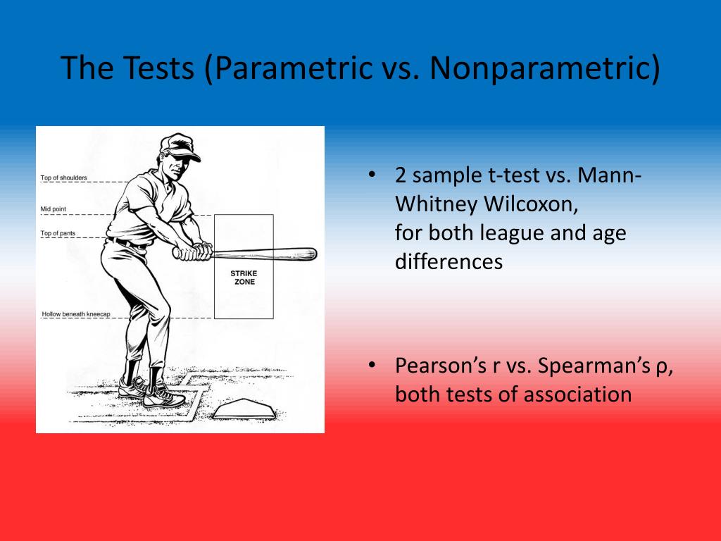 The Tests (Parametric vs. Nonparametric) • 2 sample t-test vs. Mann-Whitney Wilcoxon, for both league and age differences • Pearson’s r vs. Spearman’s ρ, both tests of association