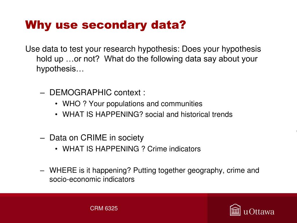 When to use secondary data? • Secondary data? Use data from many hundreds or thousands of observations for statistical analysis. Statistics? Statistics are a presentation-ready form of data. Use statistics for evidence to support descriptive statements about crime in society • What’s the difference between data and statistics? • www.biblio.uottawa.ca : Search Subject Data and Statistics CRM 6325