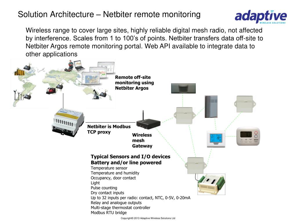 Solution Architecture – Netbiter remote monitoring Wireless range to cover large sites, highly reliable digital mesh radio, not affected by interference. Scales from 1 to 100’s of points. Netbiter transfers data off-site to Netbiter Argos remote monitoring portal. Web API available to integrate data to other applications Remote off-site monitoring using Netbiter Argos Netbiter is Modbus TCP proxy Wireless mesh Gateway Typical Sensors and I/O devices Battery and/or line powered Temperature sensor Temperature and humidity Occupancy, door contact Light Pulse counting Dry contact inputs Up to 32 inputs per radio: contact, NTC, 0-5V, 0-20mA Relay and analogue outputs Multi-stage thermostat controller Modbus RTU bridge