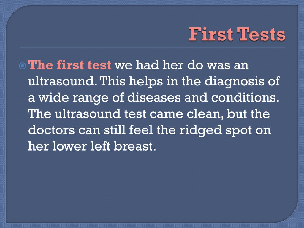 First Tests The first test we had her do was an ultrasound. This helps in the diagnosis of a wide range of diseases and conditions. The ultrasound test came clean, but the doctors can still feel the ridged spot on her lower left breast.