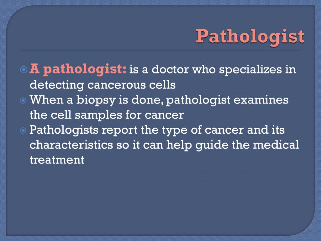 Pathologist A pathologist: is a doctor who specializes in detecting cancerous cells When a biopsy is done, pathologist examines the cell samples for cancer Pathologists report the type of cancer and its characteristics so it can help guide the medical treatment