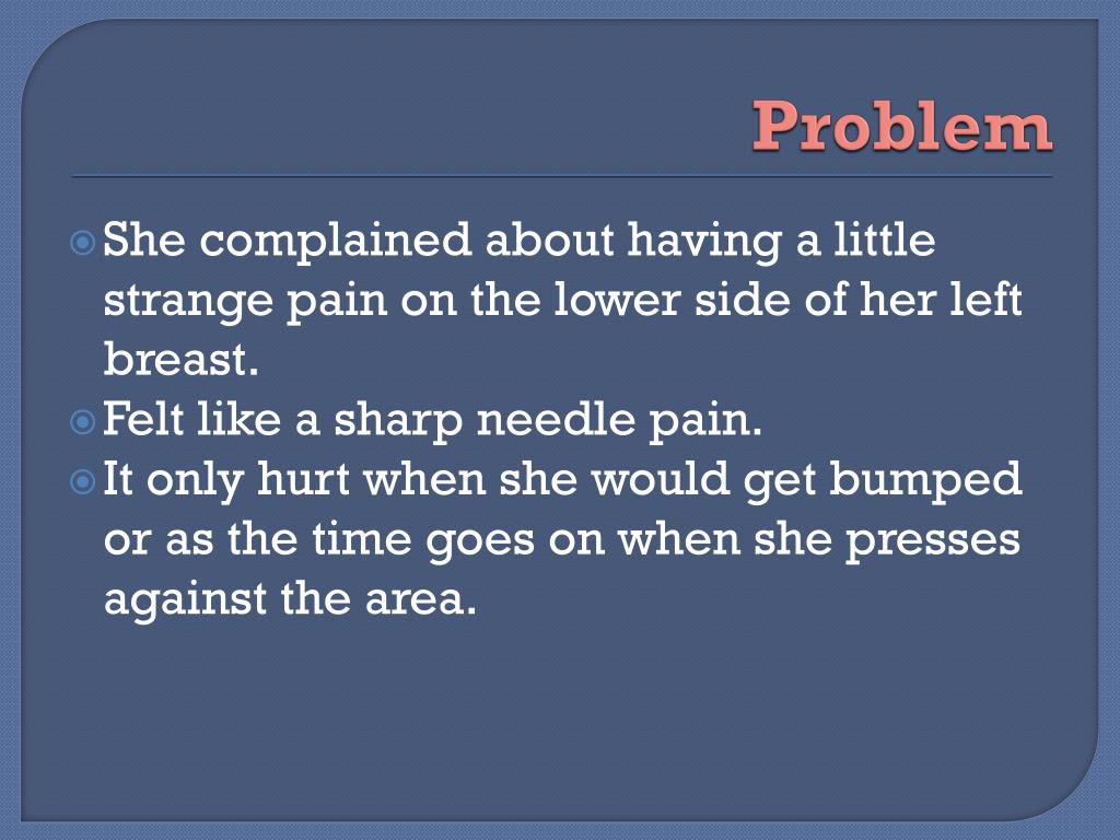 Problem She complained about having a little strange pain on the lower side of her left breast. Felt like a sharp needle pain. It only hurt when she would get bumped or as the time goes on when she presses against the area.