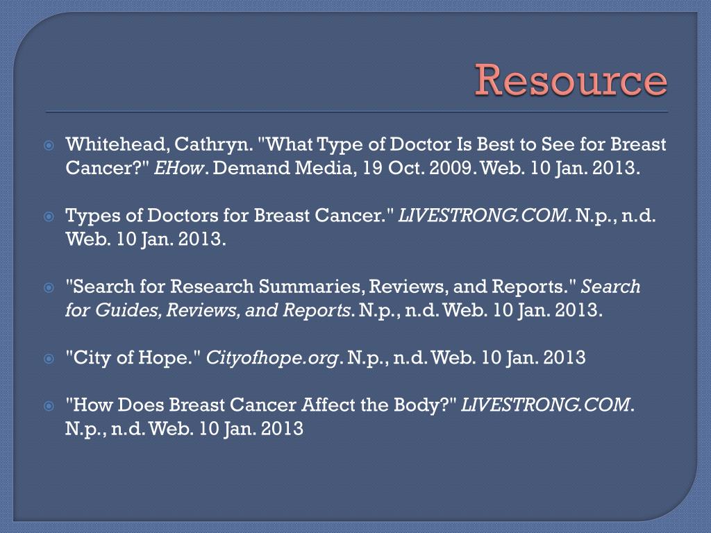 Resource • Whitehead, Cathryn. "What Type of Doctor Is Best to See for Breast Cancer?" EHow. Demand Media, 19 Oct. 2009. Web. 10 Jan. 2013. • Types of Doctors for Breast Cancer." LIVESTRONG.COM. N.p., n.d. Web. 10 Jan. 2013. • "Search for Research Summaries, Reviews, and Reports." Search for Guides, Reviews, and Reports. N.p., n.d. Web. 10 Jan. 2013. • "City of Hope." Cityofhope.org. N.p., n.d. Web. 10 Jan. 2013 • "How Does Breast Cancer Affect the Body?" LIVESTRONG.COM. N.p., n.d. Web. 10 Jan. 2013
