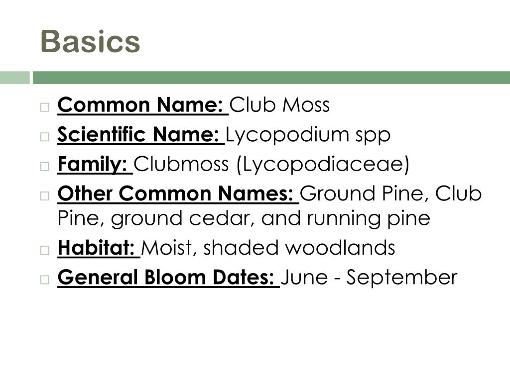 Basics • Common Name:Club Moss • Scientific Name:Lycopodiumspp • Family:Clubmoss (Lycopodiaceae) • Other Common Names:Ground Pine, Club Pine, ground cedar, and running pine • Habitat:Moist, shaded woodlands • General Bloom Dates:June - September