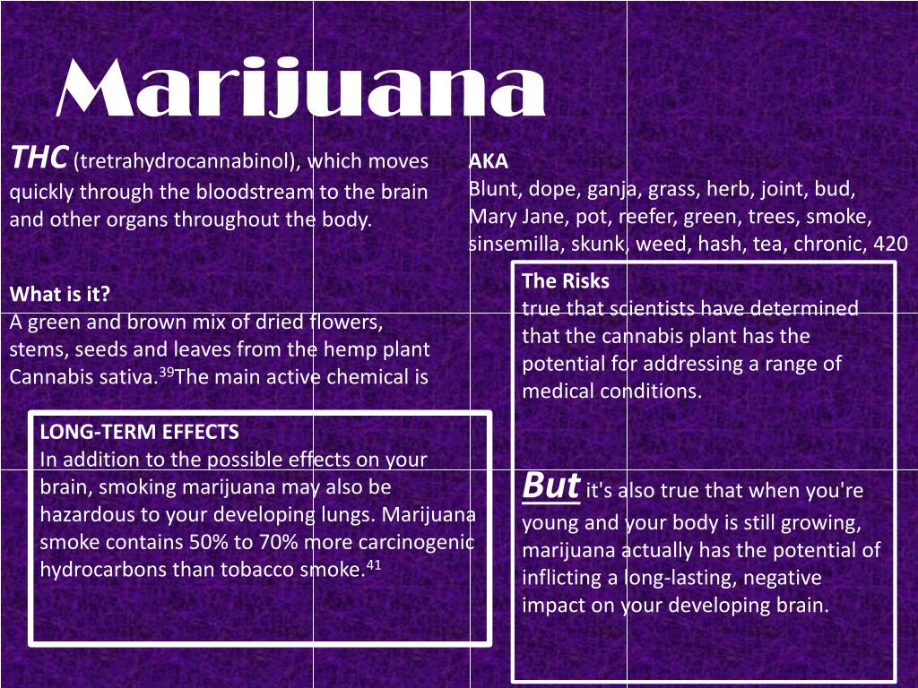 Marijuana AKA Blunt, dope, ganja, grass, herb, joint, bud, Mary Jane, pot, reefer, green, trees, smoke, sinsemilla, skunk, weed, hash, tea, chronic, 420 THC (tretrahydrocannabinol), which moves quickly through the bloodstream to the brain and other organs throughout the body. The Risks true that scientists have determined that the cannabis plant has the potential for addressing a range of medical conditions. Butit's also true that when you're young and your body is still growing, marijuana actually has the potential of inflicting a long-lasting, negative impact on your developing brain. What is it? A green and brown mix of dried flowers, stems, seeds and leaves from the hemp plant Cannabis sativa.39The main active chemical is LONG-TERM EFFECTS In addition to the possible effects on your brain, smoking marijuana may also be hazardous to your developing lungs. Marijuana smoke contains 50% to 70% more carcinogenic hydrocarbons than tobacco smoke.41