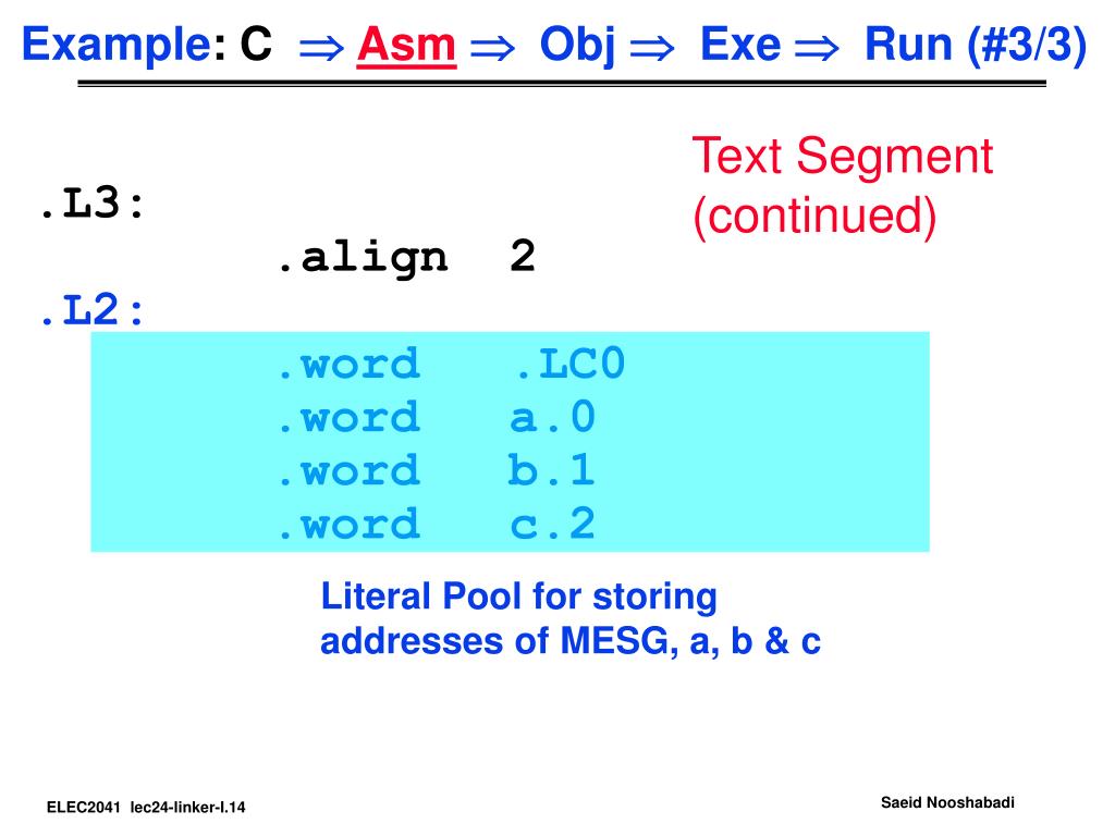 Literal Pool for storing addresses of MESG, a, b & c Example: C Asm Obj Exe Run (#3/3) Text Segment (continued) .L3: .align 2 .L2: .word .LC0 .word a.0 .word b.1 .word c.2