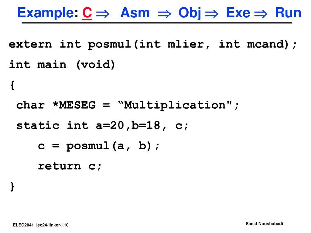 Example: C Asm Obj Exe Run extern int posmul(int mlier, int mcand); int main (void) { char *MESEG = “Multiplication"; static int a=20,b=18, c; c = posmul(a, b); return c; }