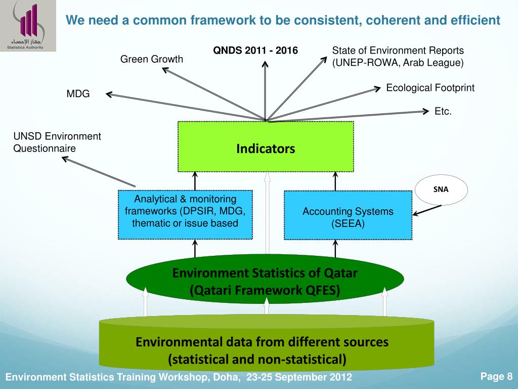 Indicators Analytical & monitoring frameworks (DPSIR, MDG, thematic or issue based Accounting Systems (SEEA) Environment Statistics of Qatar (Qatari Framework QFES) We need a common framework to be consistent, coherent and efficient QNDS 2011 - 2016 State of Environment Reports (UNEP-ROWA, Arab League) Green Growth Ecological Footprint MDG Etc. . UNSD Environment Questionnaire . SNA . Environmental data from different sources (statistical and non-statistical)