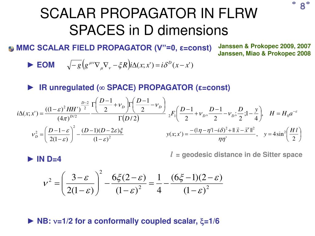 ˚ 8˚ SCALAR PROPAGATOR IN FLRW SPACES in D dimensions Janssen & Prokopec 2009, 2007 Janssen, Miao & Prokopec 2008 MMC SCALAR FIELD PROPAGATOR (V’’=0, ε=const) ► EOM ► IR unregulated ( SPACE) PROPAGATOR (ε=const) l= geodesic distance in de Sitter space ► IN D=4 ► NB: =1/2 for a conformally coupled scalar,=1/6