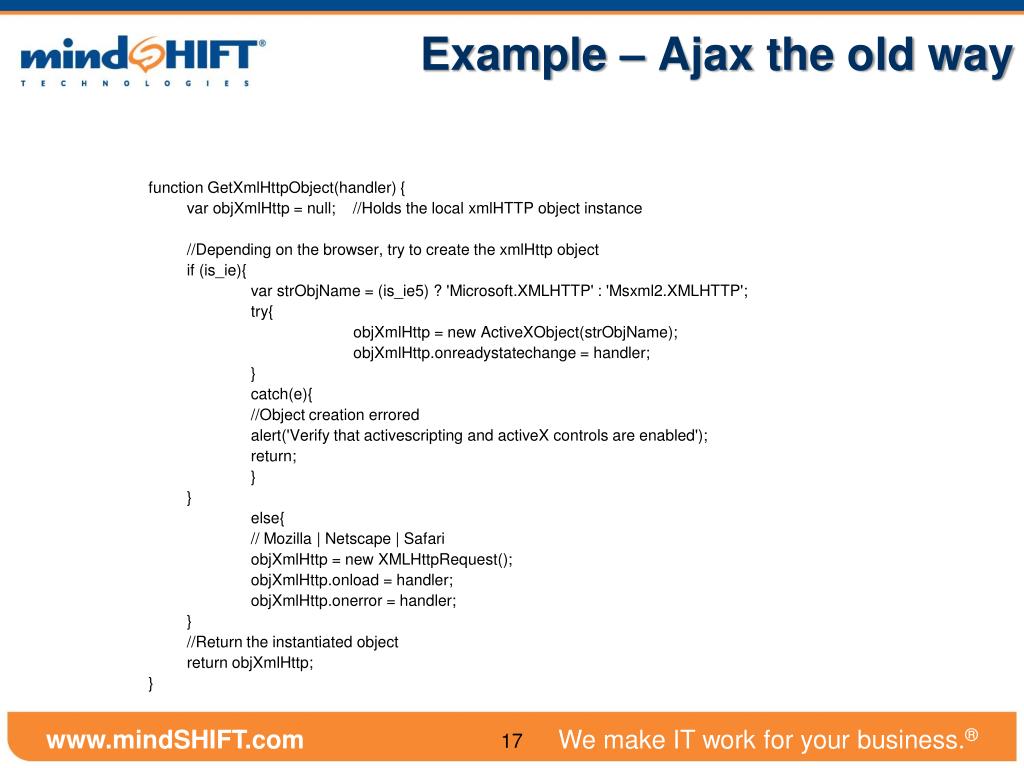 Example – Ajax the old way function GetXmlHttpObject(handler) { varobjXmlHttp = null; //Holds the local xmlHTTP object instance //Depending on the browser, try to create the xmlHttp object if (is_ie){ varstrObjName = (is_ie5) ? 'Microsoft.XMLHTTP' : 'Msxml2.XMLHTTP'; try{ objXmlHttp = new ActiveXObject(strObjName); objXmlHttp.onreadystatechange = handler; } catch(e){ //Object creation errored alert('Verify that activescripting and activeX controls are enabled'); return; } } else{ // Mozilla | Netscape | Safari objXmlHttp = new XMLHttpRequest(); objXmlHttp.onload = handler; objXmlHttp.onerror = handler; } //Return the instantiated object return objXmlHttp; } 17 www.mindSHIFT.com We make IT work for your business.®