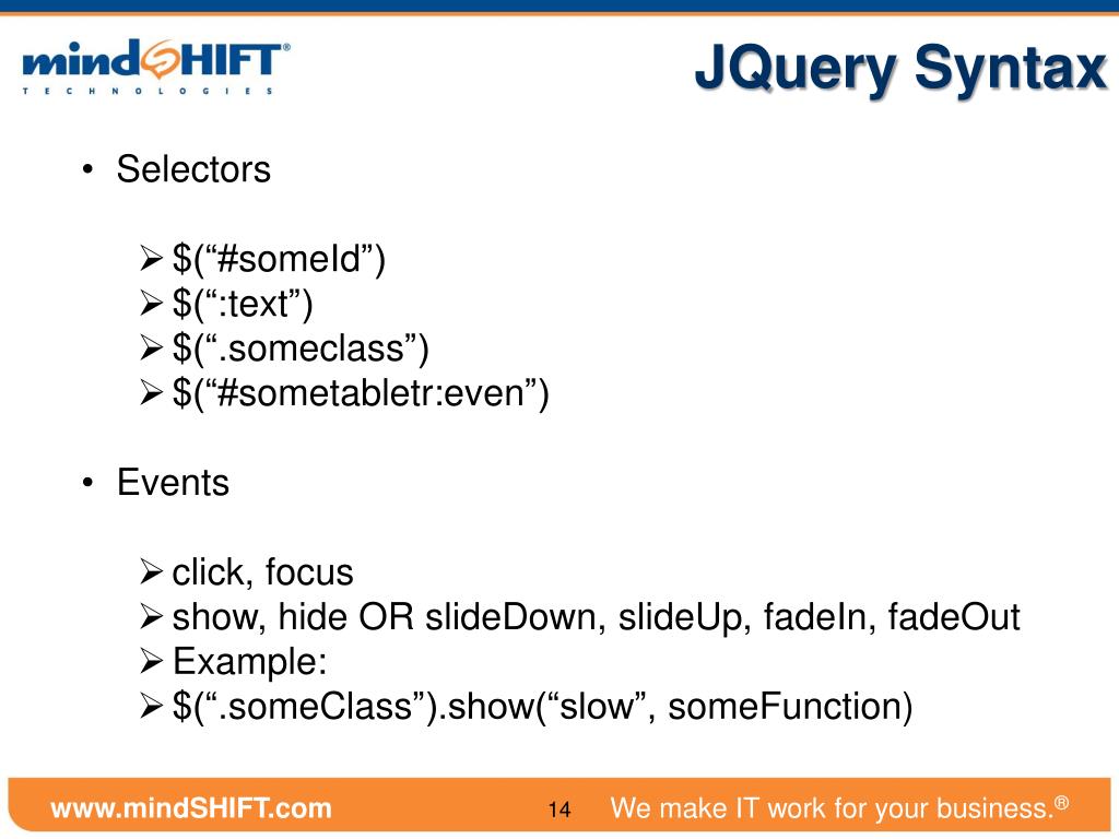 JQuery Syntax • Selectors • $(“#someId”) • $(“:text”) • $(“.someclass”) • $(“#sometabletr:even”) • Events • click, focus • show, hide OR slideDown, slideUp, fadeIn, fadeOut • Example: • $(“.someClass”).show(“slow”, someFunction) 14 www.mindSHIFT.com We make IT work for your business.®