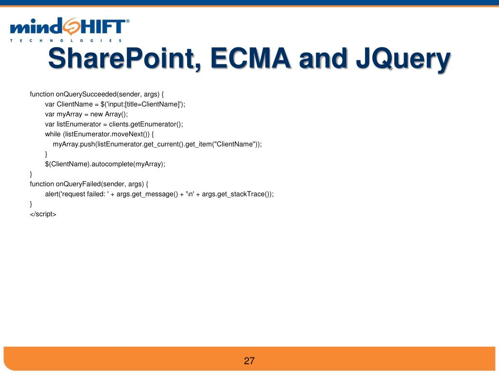 SharePoint, ECMA and JQuery function onQuerySucceeded(sender, args) { varClientName = $('input:[title=ClientName]'); varmyArray = new Array(); varlistEnumerator = clients.getEnumerator(); while (listEnumerator.moveNext()) { myArray.push(listEnumerator.get_current().get_item("ClientName")); } $(ClientName).autocomplete(myArray); } function onQueryFailed(sender, args) { alert('request failed: ' + args.get_message() + '\n' + args.get_stackTrace()); } </script> 27