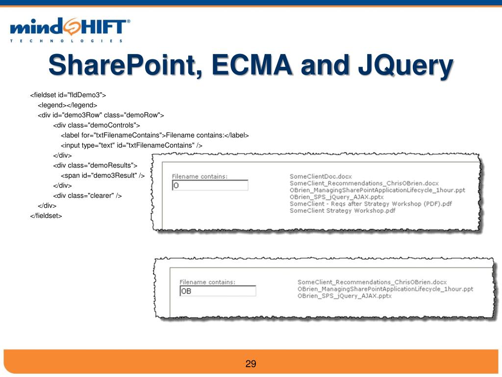 SharePoint, ECMA and JQuery <fieldset id="fldDemo3"> <legend></legend> <div id="demo3Row" class="demoRow"> <div class="demoControls"> <label for="txtFilenameContains">Filename contains:</label> <input type="text" id="txtFilenameContains" /> </div> <div class="demoResults"> <span id="demo3Result" /> </div> <div class="clearer" /> </div> </fieldset> 29