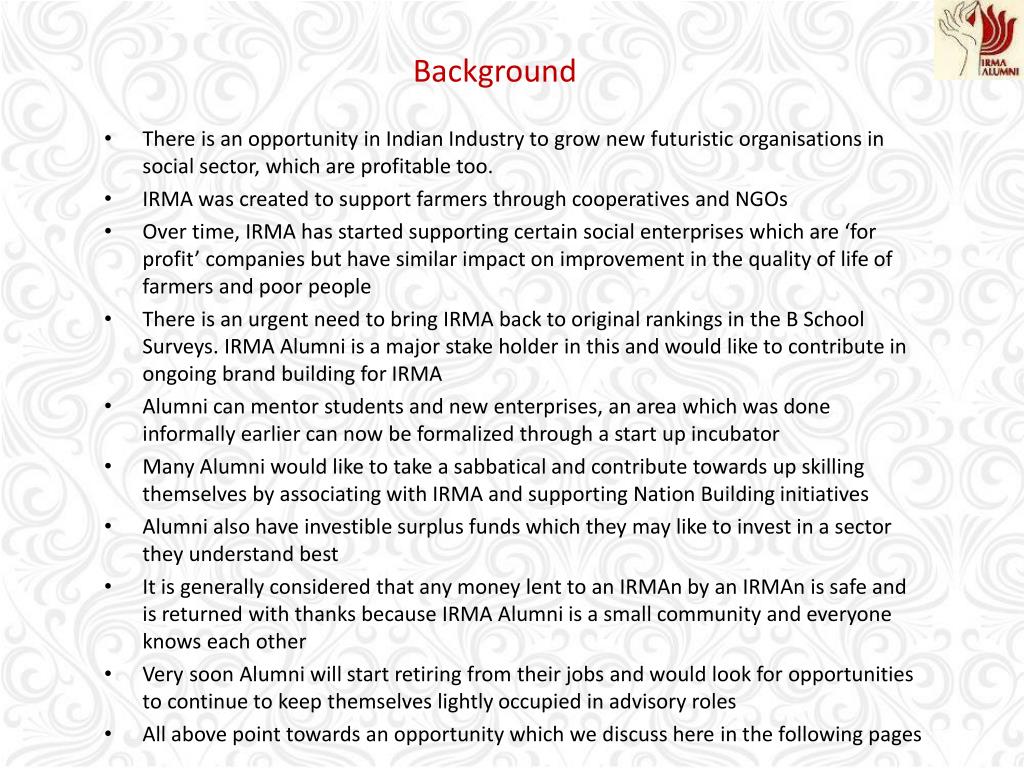 Background • There is an opportunity in Indian Industry to grow new futuristic organisations in social sector, which are profitable too. • IRMA was created to support farmers through cooperatives and NGOs • Over time, IRMA has started supporting certain social enterprises which are ‘for profit’ companies but have similar impact on improvement in the quality of life of farmers and poor people • There is an urgent need to bring IRMA back to original rankings in the B School Surveys. IRMA Alumni is a major stake holder in this and would like to contribute in ongoing brand building for IRMA • Alumni can mentor students and new enterprises, an area which was done informally earlier can now be formalized through a start up incubator • Many Alumni would like to take a sabbatical and contribute towards up skilling themselves by associating with IRMA and supporting Nation Building initiatives • Alumni also have investible surplus funds which they may like to invest in a sector they understand best • It is generally considered that any money lent to an IRMAn by an IRMAn is safe and is returned with thanks because IRMA Alumni is a small community and everyone knows each other • Very soon Alumni will start retiring from their jobs and would look for opportunities to continue to keep themselves lightly occupied in advisory roles • All above point towards an opportunity which we discuss here in the following pages