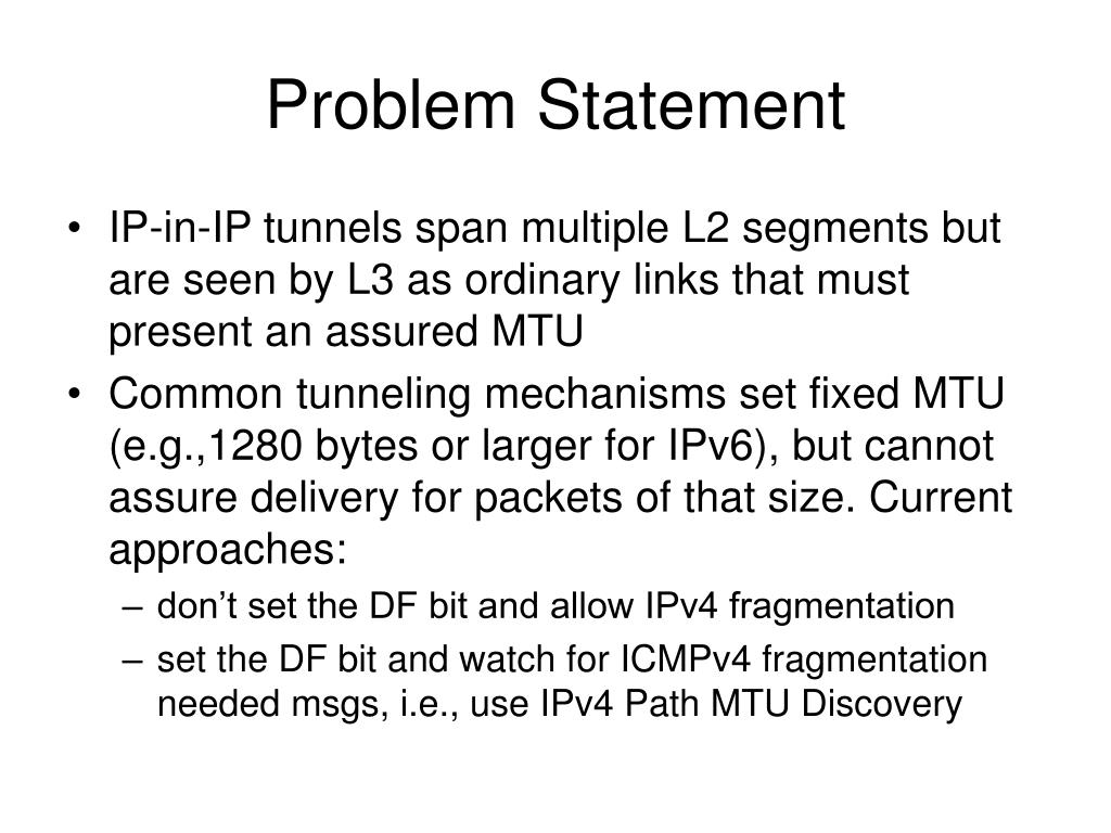 Problem Statement • IP-in-IP tunnels span multiple L2 segments but are seen by L3 as ordinary links that must present an assured MTU • Common tunneling mechanisms set fixed MTU (e.g.,1280 bytes or larger for IPv6), but cannot assure delivery for packets of that size. Current approaches: • don’t set the DF bit and allow IPv4 fragmentation • set the DF bit and watch for ICMPv4 fragmentation needed msgs, i.e., use IPv4 Path MTU Discovery