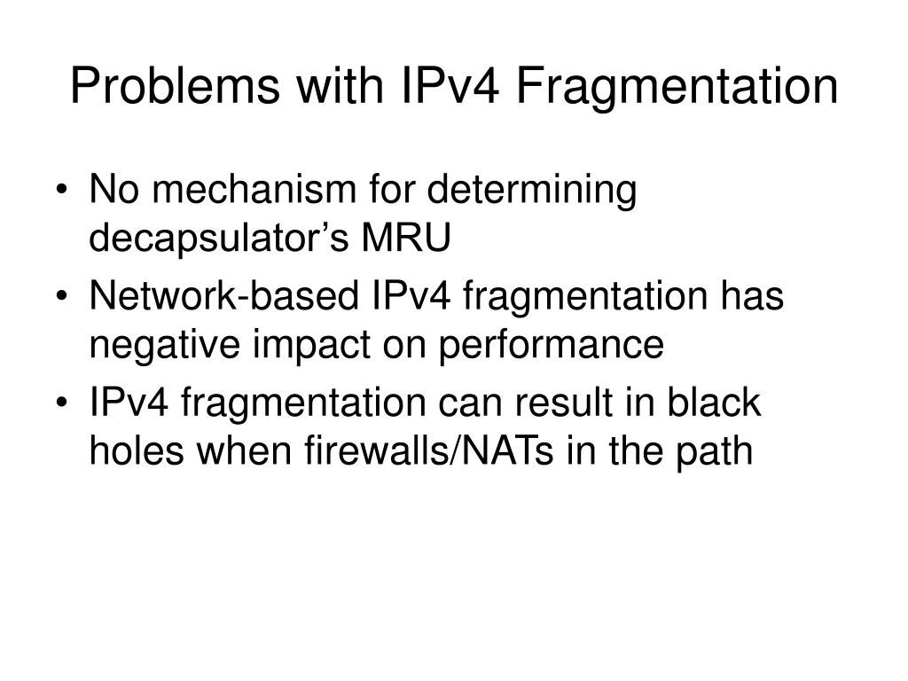 Problems with IPv4 Fragmentation • No mechanism for determining decapsulator’s MRU • Network-based IPv4 fragmentation has negative impact on performance • IPv4 fragmentation can result in black holes when firewalls/NATs in the path