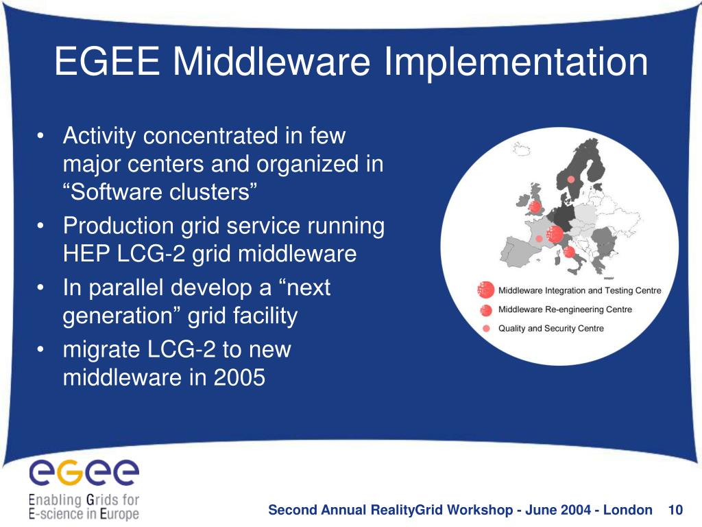 EGEE Middleware Activity • Middleware selected based on requirements of Applications and Operations • Harden and re-engineer existing middleware functionality, leveraging the experience of partners • Provide robust, supportable components • Support components evolution (WS-RF) Second Annual RealityGrid Workshop - June 2004 - London 9