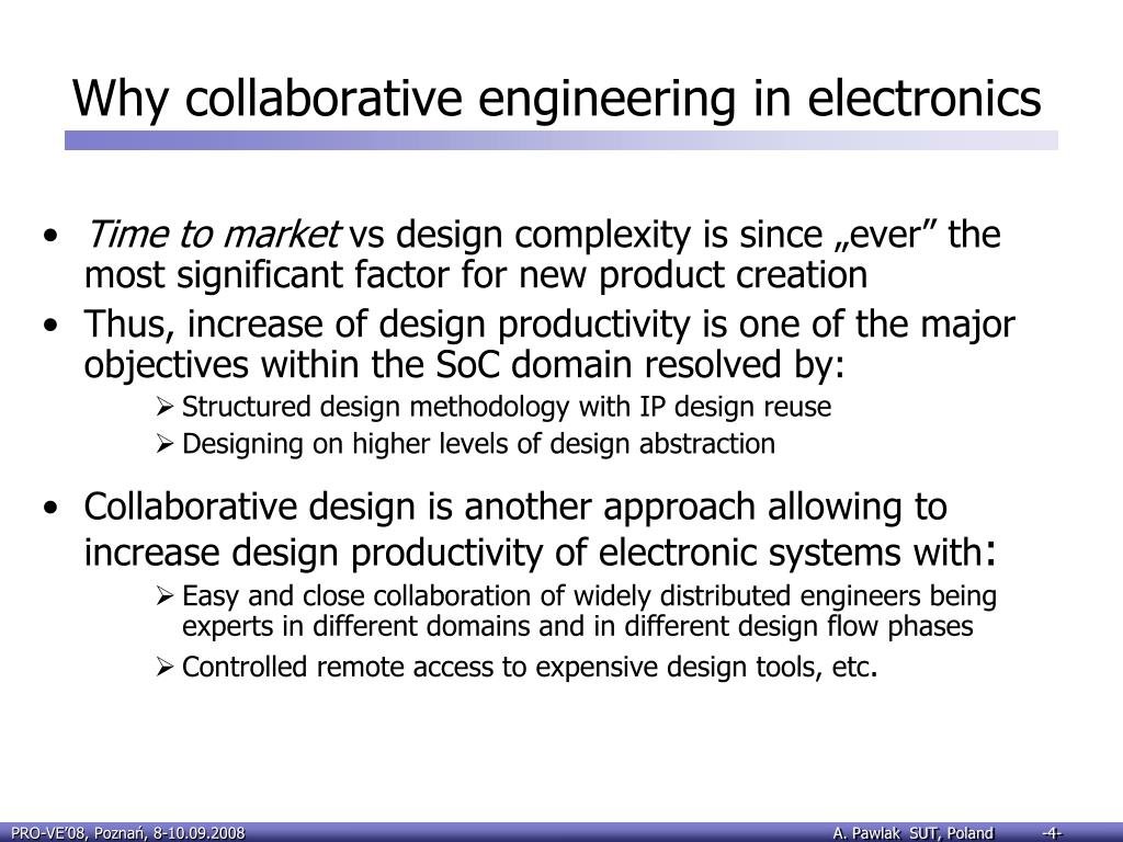 Why collaborative engineering in electronics • Time to market vs design complexity is since „ever” the most significant factor for new product creation • Thus, increase of design productivity is one of the major objectives within the SoC domain resolved by: • Structured design methodology with IP design reuse • Designing on higher levels of design abstraction • Collaborative design is another approach allowing to increase design productivity of electronic systems with: • Easy and close collaboration of widely distributed engineers being experts in different domains and in different design flow phases • Controlled remote access to expensive design tools, etc.