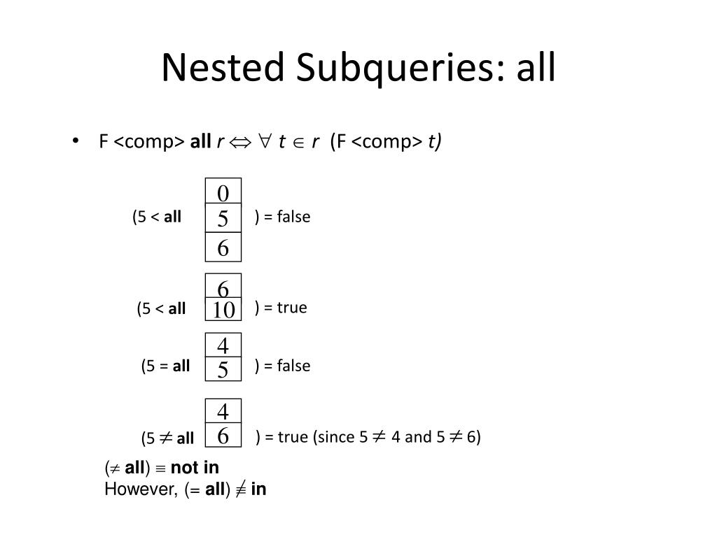 0 5 6 Nested Subqueries: all • F <comp> all r t r (F <comp> t) (5 < all ) = false 6 ) = true (5 < all 10 4 ) = false (5 = all 5 4 ) = true (since 5 4 and 5 6) (5 all 6 (all) not in However, (= all) in